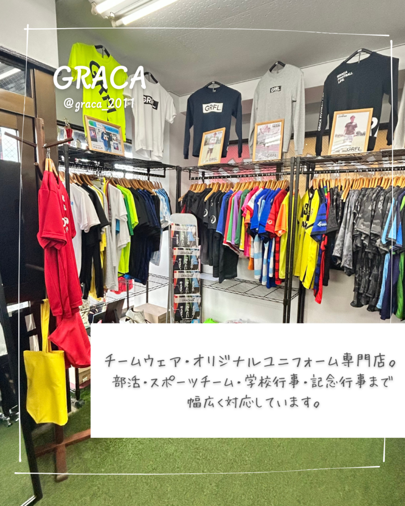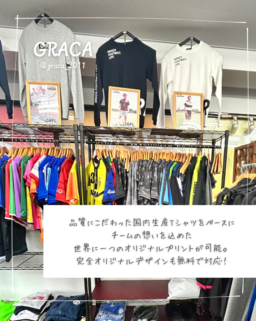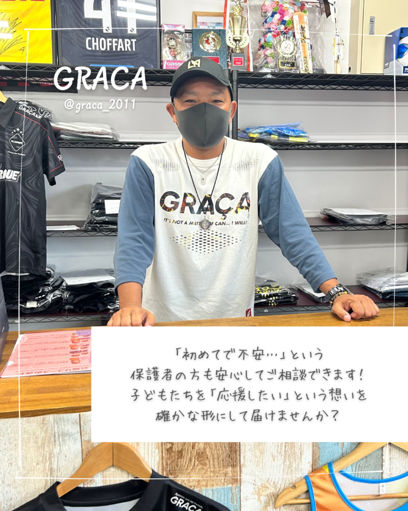 GRACAは、サッカースクール、オリジナルプリントウェア制作などを通して保護者の皆様の「子どもたちのスポーツを応援したい」という想いに寄り添ってくれる最高のパートナーです。